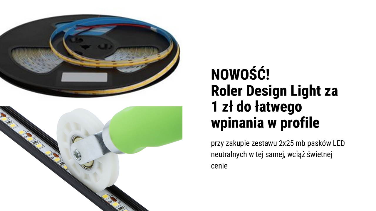 Informujemy o specjalnej ofercie przygotowanej dla naszych klientów. Przy zakupie zestawu 2x25 mb pasków LED neutralnych (COB 480/m, 11,8W/m, IP20, 8 mm) otrzymają Państwo Roler Design Light w promocyjnej cenie 1 zł.